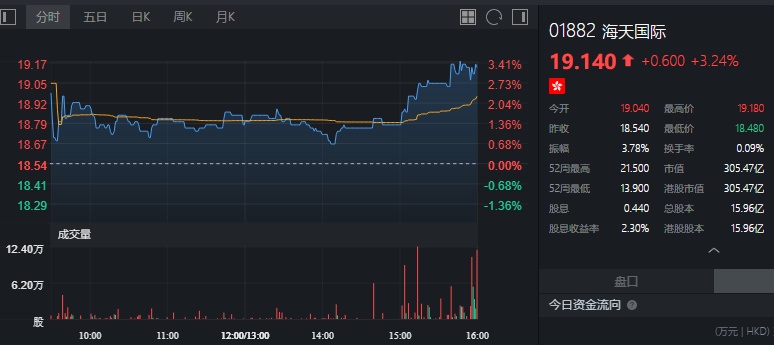 截至今日收盘,海天国际涨3.24%,报19.14港元。
