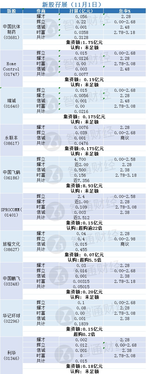智通财经APP获悉,11月1日,中国抗体制药(03681),Home Control (01747),瑞诚(01640),永联丰(08617),中国飞鹤(06186),SPROCOMM(01401),旅橙文化(08627),中国鹏飞(03348),华记环球(02296),利华(01346)正在招股中。