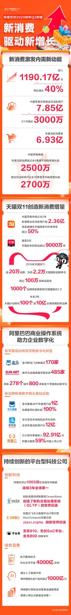 智通财经APP获悉,北京时间11月1日晚,阿里巴巴集团(BABA.US)公布截至2019年9月30日的季度业绩,中国零售市场移动月活跃用户达7.85亿,较2019年6月劲增3000万;年度活跃消费者增长1900万至6.93亿。集团收入增长40%至人民币1,190.17亿元。超预期的增长为第十一个天猫双11拉开序幕。