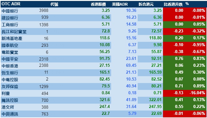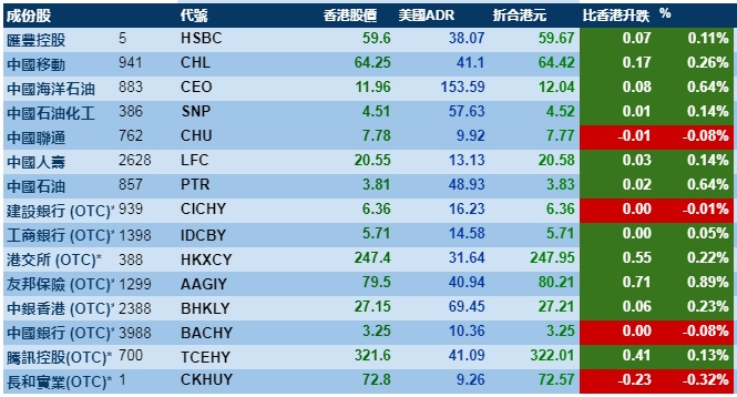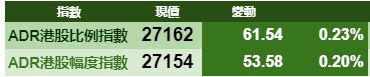 智通财经APP获悉,非农数据强劲带动美股三大指数收涨,港股ADR指数全日向好,按比例计算,收报27162点,涨61.54点或0.23%。大型蓝筹涨跌不一,汇丰控股收报59.67元,较港收市升0.07元;腾讯控股收报322.01元,较港收市升0.41元。