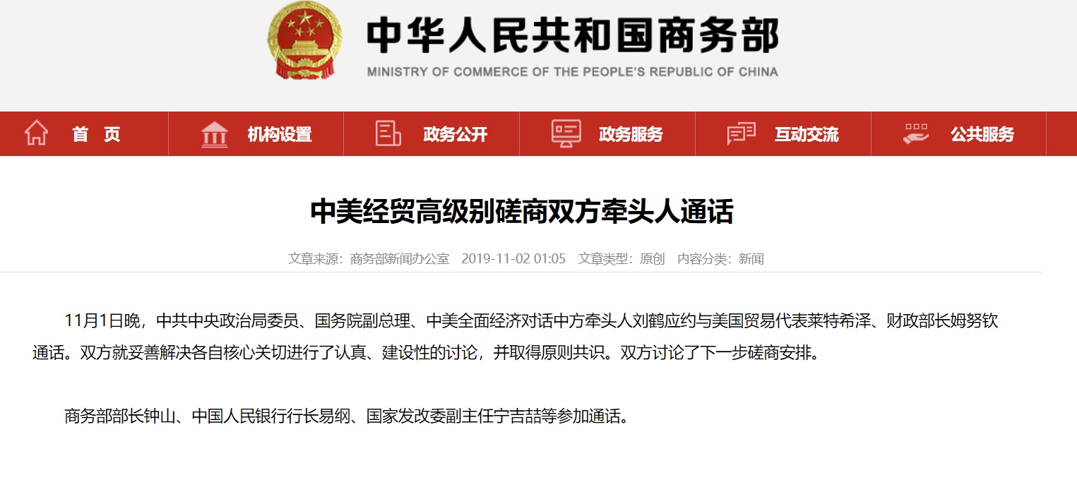 11月1日晚,中共中央政治局委员、国务院副总理、中美全面经济对话中方牵头人刘鹤应约与美国贸易代表莱特希泽、财政部长姆努钦通话。双方就妥善解决各自核心关切进行了认真、建设性的讨论,并取得原则共识。双方讨论了下一步磋商安排。