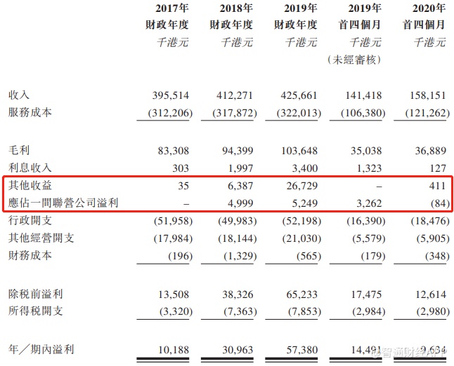 然而,净利润的增长却不是由经营带来的,而是因为其他收益和联营公司溢利。2018年其他收益639万港元,联营公司溢利499.9万港元,直接增加了超过1000万港元的非经营利润。2019财年更加夸张,其他收益高达2673万港元,占当年净利润46.6%。