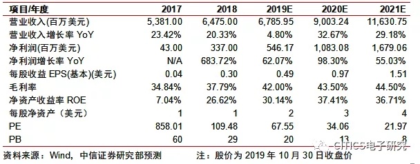 我们预计未来两年公司CPU业务将随新品发布持续提升份额,拉动营收并提高毛利率,GPU业务总体保持平稳增长。根据IDC本月公布数据,2019Q2全球服务器出货量同比-9.29%至269万台,下半年有望回暖,短期由于我们预计2019年服务器CPU市场空间低于我们先前假设,且公司Q3实际费用率高于先前假设,我们下调公司2019年净利润预测至5.46亿美元(原预测7.0亿美元),由于2020年起采用新工艺有望推升毛利率,我们小幅上调2020/2021年净利润预测至10.83/16.79亿美元(原预测10.81/16.75亿美元),对应2019~2021年EPS预测分别为0.49/0.97/1.51美元(对应除权前0.50/1.00/1.55美元,原预测0.65/1.00/1.54美元),公司有望实现持续高速成长,值得长期重点关注,维持“买入”评级。