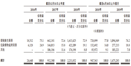 于往绩记录期间,环境卫生服务为公司的主要业务分部,分别占2016—2018财政年度及2019年截至6月30日止六个月收益约75.1%、72.6%、72.9%和74,2%。