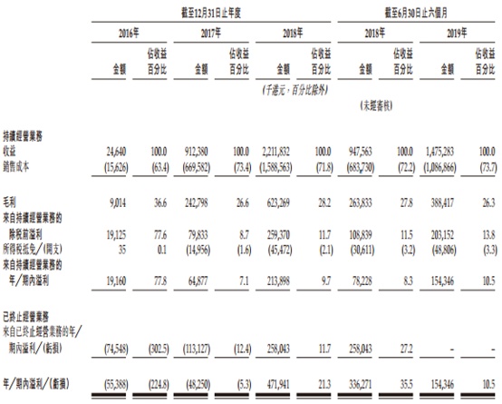 截至2016—2018财政年度及2019年截至6月30日止六个月,公司持续经营业务的收入分别为2464万港元、9.1亿港元、22亿港元及14.8亿港元。收益总额由2016年的2464万港元大幅增至2017年的9.1亿港元,主要反映来自环境卫生服务的收益因2017年收购而增加。截至2016年12月31日,公司仅有一个产生收益的环境卫生服务项目。截至2017年12月31日,公司拥有71个环境卫生服务项目。