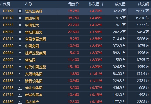 截至发稿,融创中国(01918)涨4.18%,报38.65港元;中国恒大(03333)涨4.02%,报20.2港元;合景泰富集团涨2.98%,报8.29港元;碧桂园涨2.33%,报11.4港元;中国奥园涨2.25%,报10.92港元。
