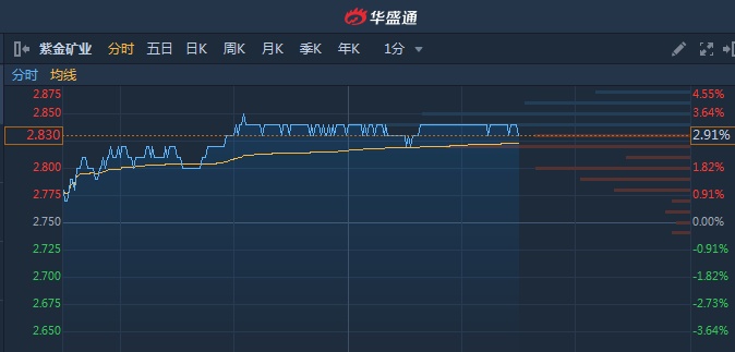 铜金矿余下下带矿权益,受益于利好消息影响,今日股价放量上涨,截至14时29分,涨3.27%,报价2.84港元,成交额6107万。