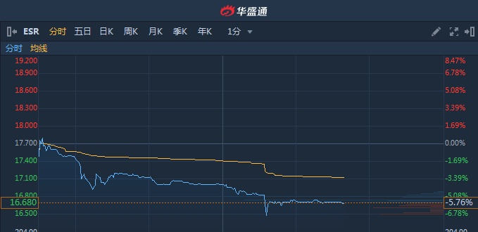 智通财经APP获悉,ESR(01821)上市次日股价破发,放量下挫逾5%,截至14时38分,跌5.76%,报价16.68港元,成交额2.364亿。值得一提的是,该股每股发行价为16.8港元,今日盘中曾一度低见16.42港元。