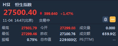 智通财经APP获悉,蓝筹股午后全线走强,带动恒指涨近400点。恒指盘中一度收复27500关口,创近三个月新高。
