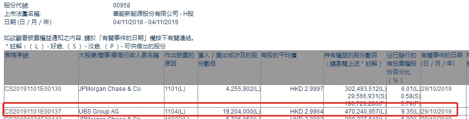智通财经APP获悉,联交所最新资料显示,10月29日,瑞银增持华能新能源(00958)1920.4万股,每股作价2.9964港元,总金额约为5754.29万港元。增持后最新持股数目约为4.70亿股,最新持股比例为9.35%。