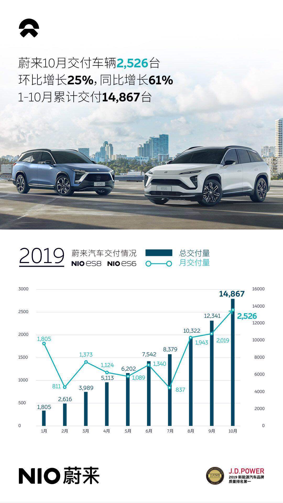 智通财经APP获悉,11月4日消息,蔚来(NIO.US)公布的销量数据显示,蔚来10月交付量达2526台,创2019年新高,环比上涨25%,同比增长61%。蔚来9、10两月连破月度交付记录,完美收官金九银十。
