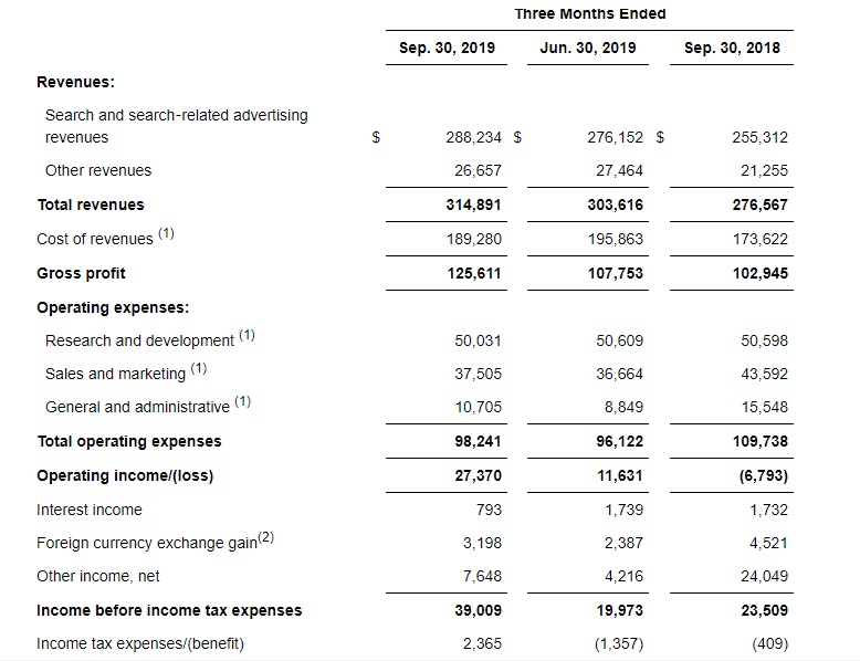 财报显示,搜狗第三季度的总收入为3.15亿美元,同比增长14%。其中搜索和搜索相关的收入为 2.882亿美元,同比增长13%。该增长主要是由于拍卖式点击付费服务的增长。其他收入为 2670万美元,同比增长25%。该增加主要是由于智能硬件产品销售收入的增加。