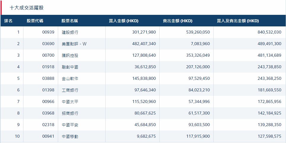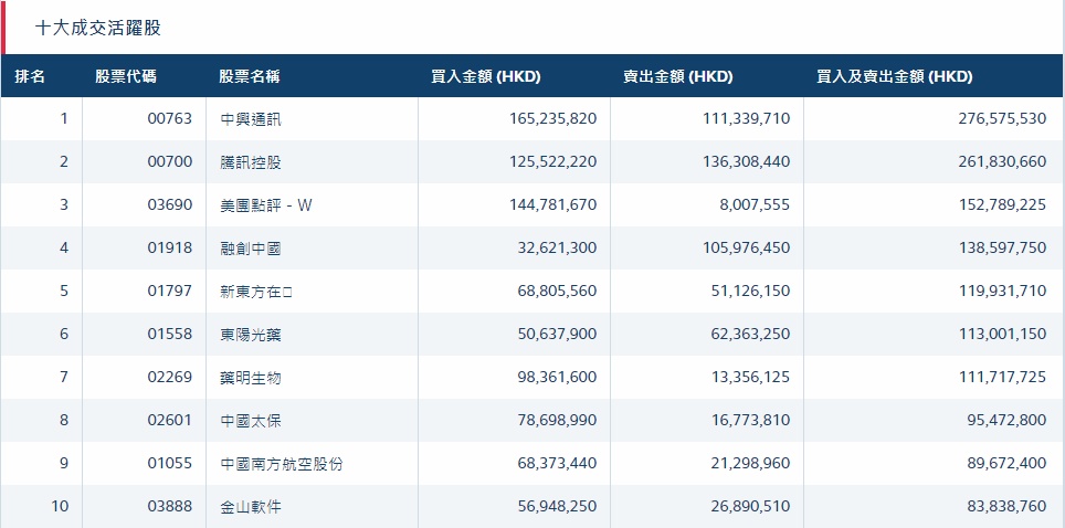 药明生物(02269)、中兴通讯(00763)、中国南方航空股份(01055)分别获净买入8500万、5389万、4707万港元。此外,北水主要沽售中国移动(00941),净卖出额为1.08亿港元。