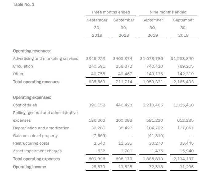 智通财经APP获悉,美东时间11月4日美股盘前,数字媒体和营销解决方案公示甘尼特(GCI.US)公布了2019年第三季度财报,报告显示,GCI本季度营业收入为6.35亿美元,同比降低11%。