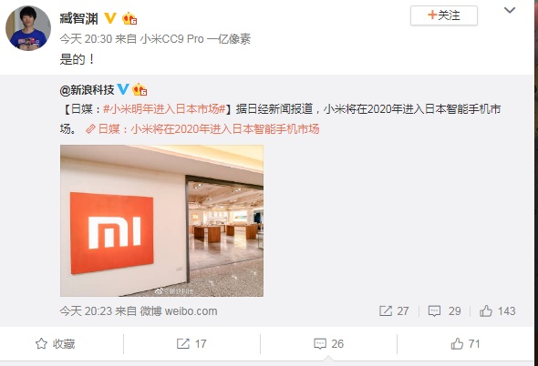 智通财经APP获悉,11月4日,据媒体报道,小米将在2020年进入日本智能手机市场。小米手机产品市场总监臧智渊在微博转发这一消息并确认小米将在2020年进入日本智能手机市场。