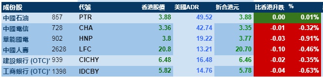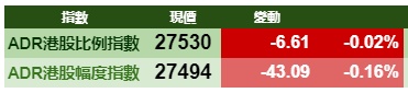 智通财经APP获悉,美股创新高,但港股ADR指数全日无甚亮眼表现,按比例计算,收报27530点,跌6.61点或0.02%。大型蓝筹涨跌不一,汇丰控股收报60.37元,较港收市升0.27元;腾讯控股收报328.89元,较港收市升1.29元。