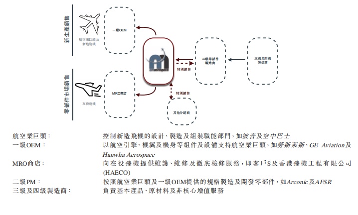 作为存货分销商,公司主要自上游二级零部件制造商(二级PM)采购C级飞机零部件并将其储存、供应及分销予下游一级原始设备制造商(一级OEM)、其分包商及维护、维修及彻底检修商店(MRO商店)。下图显示公司在典型全球民用航空航天供应链中的主要业务模式: