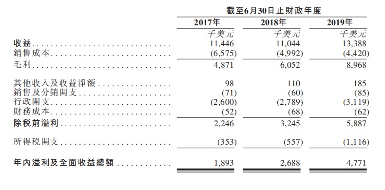 公司新生产销售及零部件市场销售共同贡献总收益的大部分。于往绩记录期间,公司收益由截至2017年及2018年6月30日止财政年度分别为1145万美元及1104万美元增至截至2019年6月30日止财政年度的1339万美元。于相同年度,溢利由189万美元及270万美元增至477万美元。于往绩记录期间,平均毛利率为54.8%。