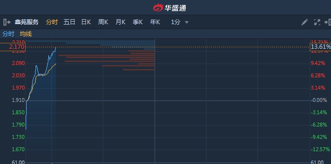 智通财经APP获悉,次新股鑫苑服务(01895)止跌反弹,连续两个交易日累计涨幅超20%。截至10时04分,涨13.09%,报价2.16港元,成交额1138万。