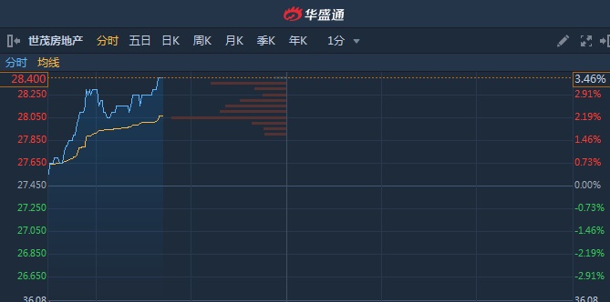 智通财经APP获悉,世茂房地产(00813)10月合约销售额同比增长53%至232.4亿元,超市场预期,早盘股价破顶,高见28.5港元,创历史新高。截至10时42分,涨3.46%,报价28.4港元,成交额5916万。