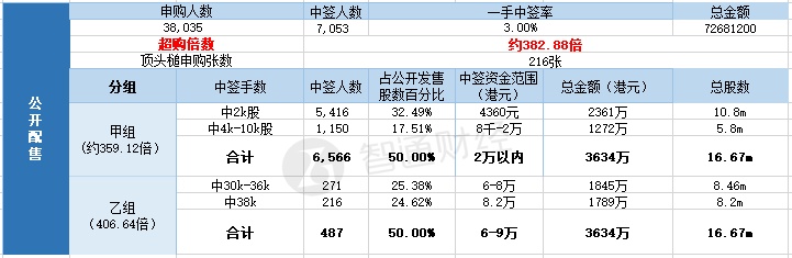 其中,公开配售申购人数38035,一手中签率3%,认购倍数约382.88倍。
