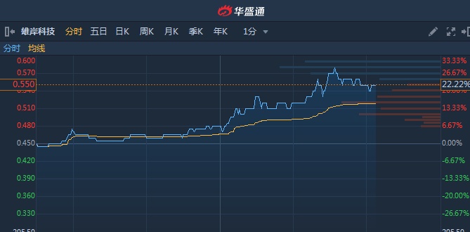 智通财经APP获悉,雄岸科技(01647)获天风证券唱好,评级“强于大市”。该股午后放量急升,截至15时05分,涨22.22%,报价0.55港元,成交额1899万。