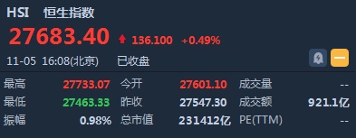 智通财经APP获悉,恒指早盘高开53.8点或0.2%,报27601.1点。截至收盘,恒生指数涨136.1点或0.49%,报27683.4点,全日成交额达921.17亿。国企指数涨0.59%,报10877.63点,红筹指数涨0.8%,报4431.51点。