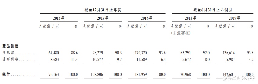 公司的主打产品是用于治疗IPF的艾思瑞,国家医保药品目录中唯一治疗IPF的药物。临床研究表明,艾思瑞可有效减缓肺功能衰退及IPF疾病进展。在中国,罕见病用药以进口为主,但按2018年在中国的销售额计,艾思瑞占据超过90%的市场份额。