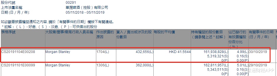 智通财经APP获悉,联交所最新资料显示,10月30日,摩根士丹利减持华润啤酒(00291)43.27万股,每股作价41.5644港元,总金额约为1798.49万港元。减持后最新持股数目约为1.62亿股,最新持股比例为4.99%。