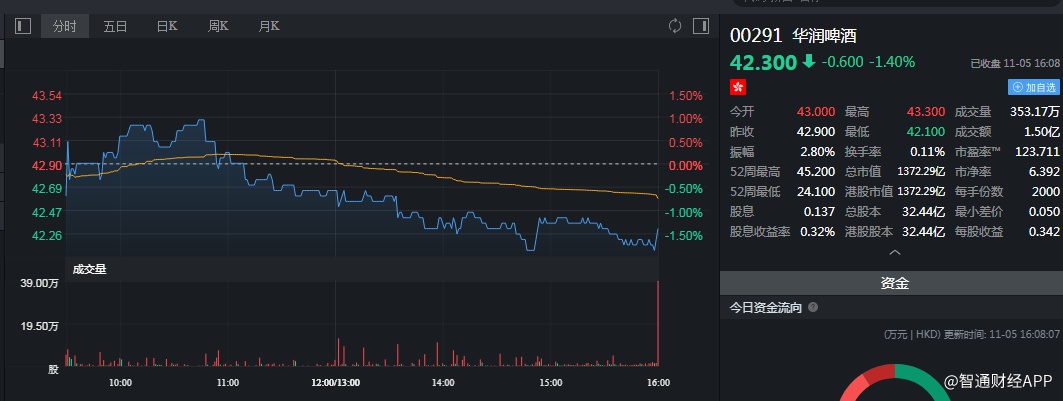 截至今日收盘,华润啤酒(00291)跌1.40%,报42.30港元。