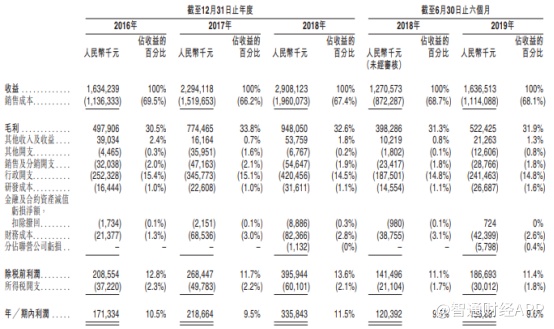 数据显示,2016-2018年间,年营收总额从人民币16.3亿元增长至29.1亿元,年增长率约为33%。2019上半年与2018上半年相比,也有较大涨幅,营收增长约3.66亿元,增长率约为28.8%。
