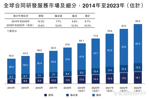 在全球市场方面,2018年全球合同研发服务市场达579亿美元,预计到2023年将增至952亿美元,复合年增长率为10.5%,而2018年全球合同研发服务市场的渗透率达37.2%,预计到2023年将进一步升至48.0%。国内市场方面,近年来中国的药物研发支出大幅增长,2018年达174亿美元,预计2023年将增至493亿美元,复合年增长率为23.1%。