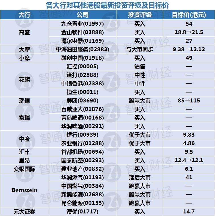 四、各大行对其他港股最新投资评级及目标价