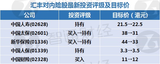 一、汇丰对内险股最新投资评级及目标价