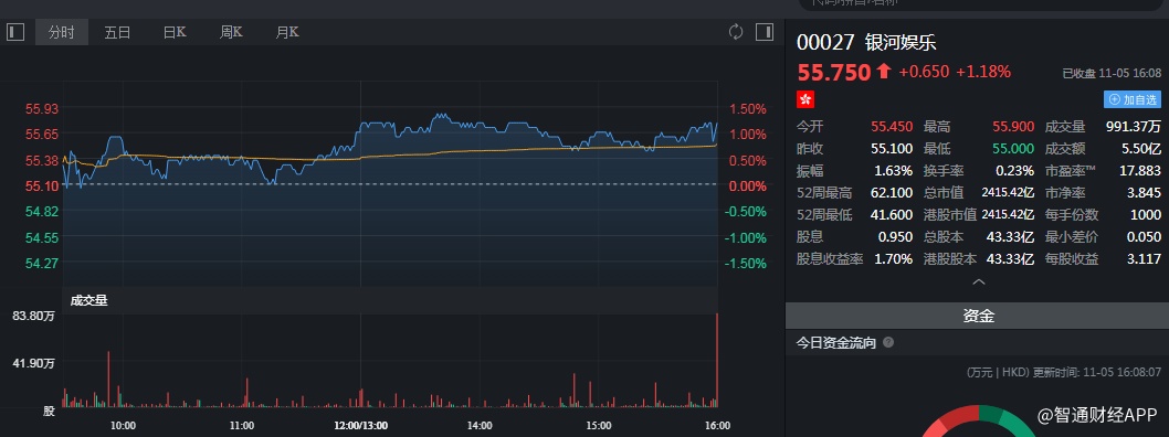 截至今日收盘,银河娱乐(00027)涨1.18%,报55.75港元。