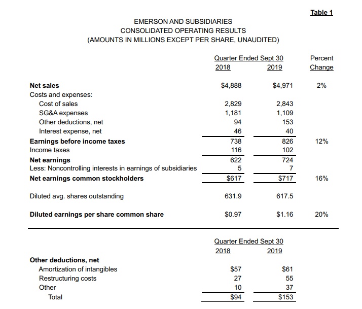 财报显示,本季度艾默生电气归属于股东的净利润为7.17亿美元,同比增长16%,摊薄后每股收益为1.16美元,同比增长20%。2019财年全年归属于股东的净利润为23亿美元,同比增长5%,摊薄后每股收益为3.71美元。