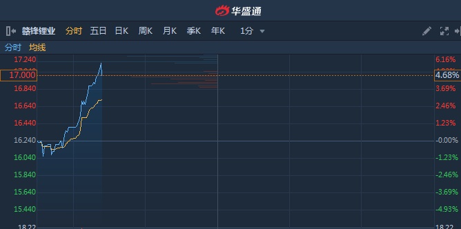 智通财经APP获悉,赣锋锂业(01772)盘中一度高见17.18港元,创历史新高,截至10时23分,涨5.54%,报价17.14港元,成交额1459万。