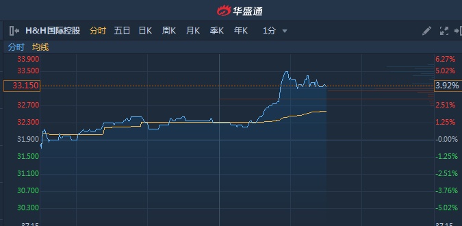 智通财经APP获悉,H&H国际控股(01112)绩后获大和重申“买入”评级,目标价下调至47港元,截至14时30分,涨3.92%,报价33.15港元,成交额5585万。
