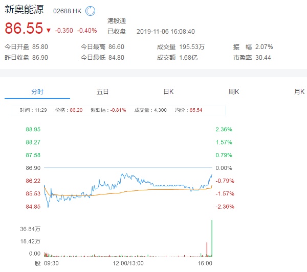 截至今日收盘,新奥能源(02688)跌0.4%,报86.55港元。