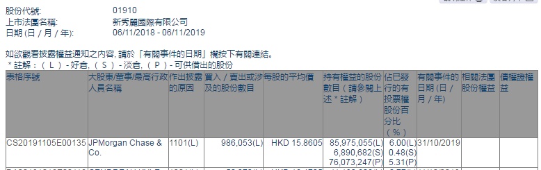 智通财经APP获悉,联交所最新资料显示,10月31日,摩根大通增持新秀丽(01910)98.6万股,每股作价15.86港元,总金额约为1563.79万港元。增持后最新持股数目约为8597.5万股,最新持股比例为6%。