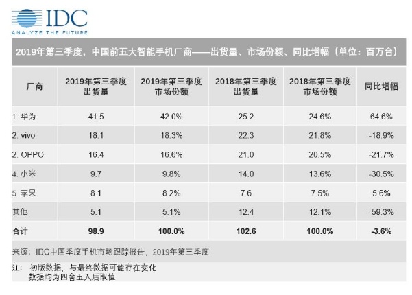 智通财经APP获悉,国际数据公司IDC今日发布手机季度跟踪报告。2019年第三季度,中国智能手机市场出货量约9890万台,同比下降3.6%,降幅较今年上半年有所收窄。