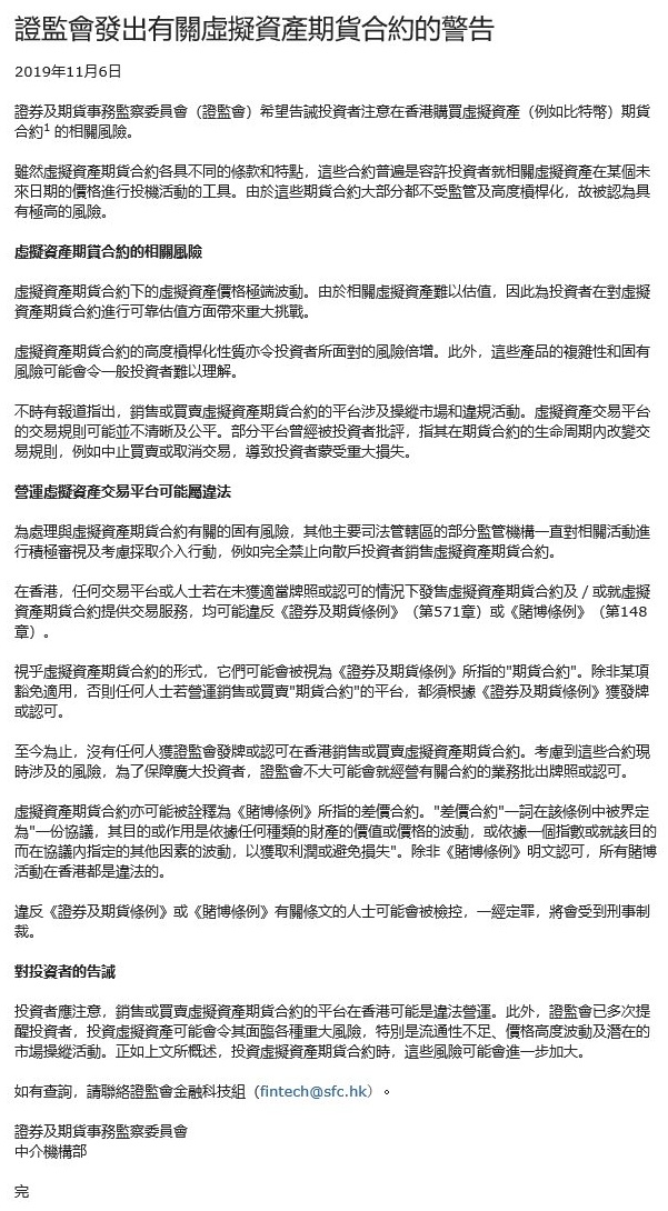 智通财经APP获悉,11月6日,香港证监会发布声明,证券及期货事务监察委员会(证监会)希望告诫投资者注意在香港购买虚拟资产(例如比特币)期货合约的相关风险。