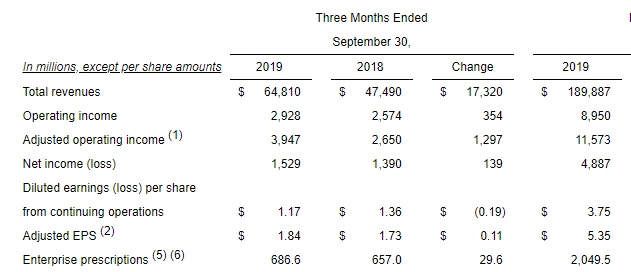 智通财经APP获悉,美东时间11月6日美股盘前,美国零售和医疗保健公司CVS健康公司(CVS.US)公布了2019年第三季度财报。报告显示,CVS第三季度总收入达648亿美元,同比增长36.5%。