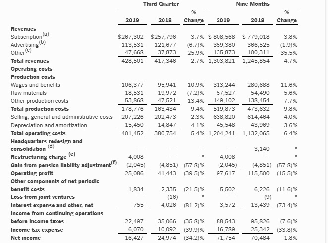 2019年第三季度的营业利润从2018年同期的4140万美元下降至2510万美元,调整后的营业利润(以下定义)从上年的5370万美元下降至4410万美元,原因是成本上升和广告收入下降抵消了更高的纯数字订阅收入和其他收入。