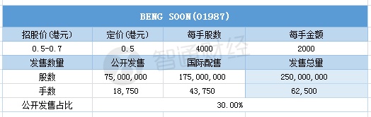 SOON(01987)配售结束。配售招股价区间为0.5-0.7港元,最终定价0.5港元,每手2000港元。