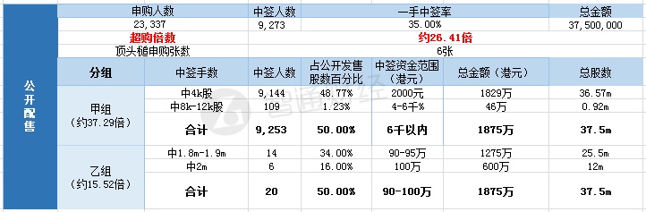其中,公开配售申购人数23337,一手中签率35%,超购倍数约26.41倍。