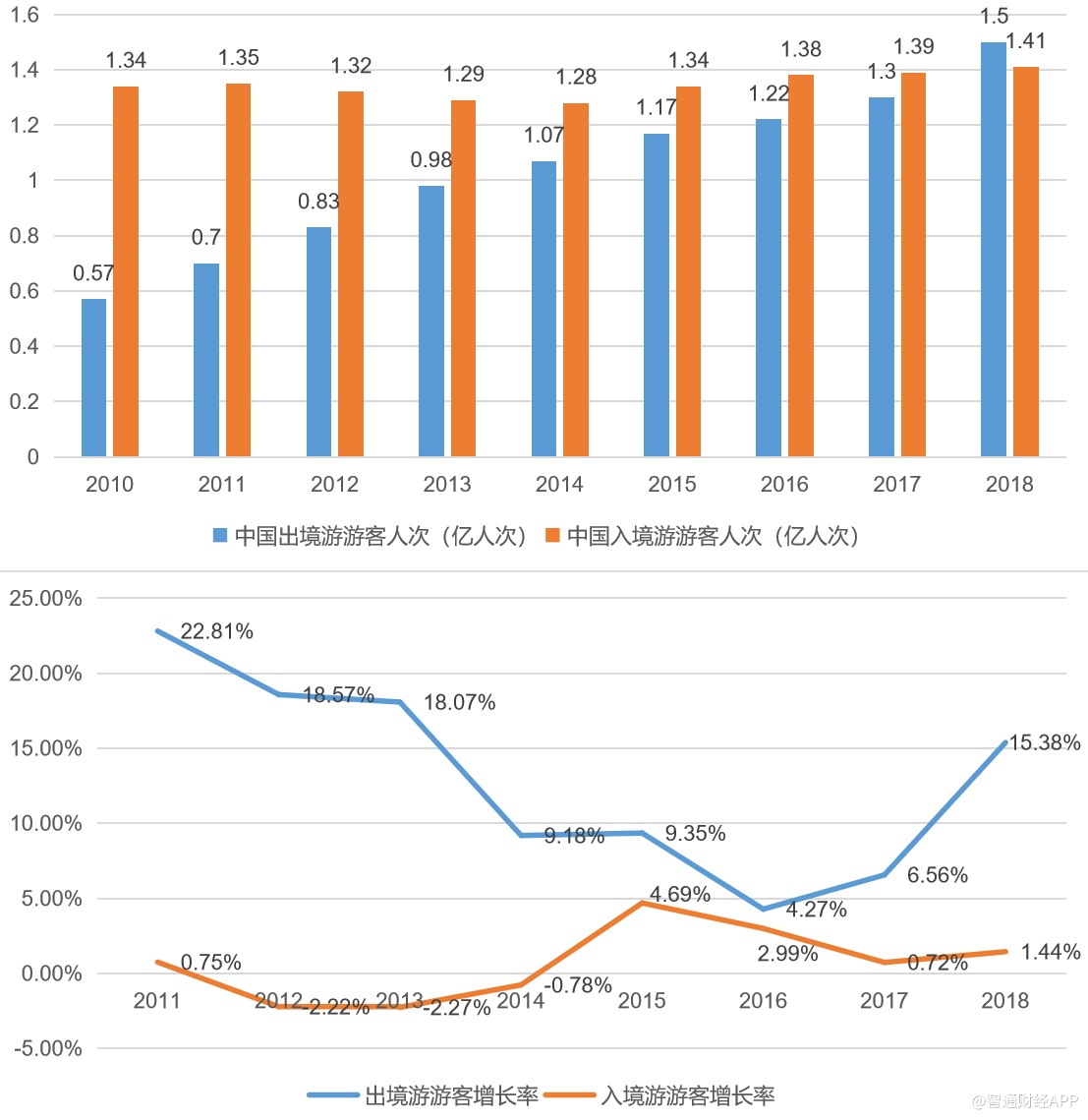 2018年,国内旅游人次增长12.64%,创下2012年以来的新高,并保持着强劲的增长趋势,出境旅游人次增长15.38%,恢复2013年之前的较高的增长通道。