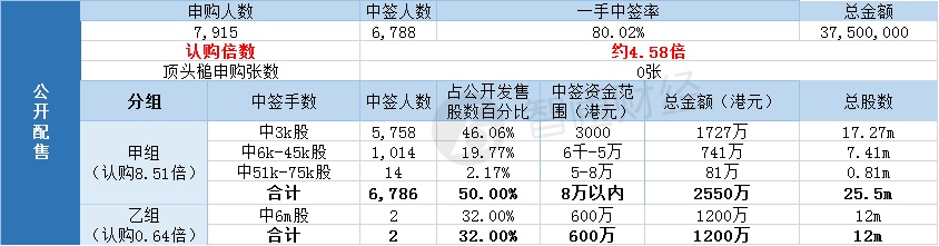 其中,公开配售申购人数7915,一手中签率80.02%,认购倍数约4.58倍。