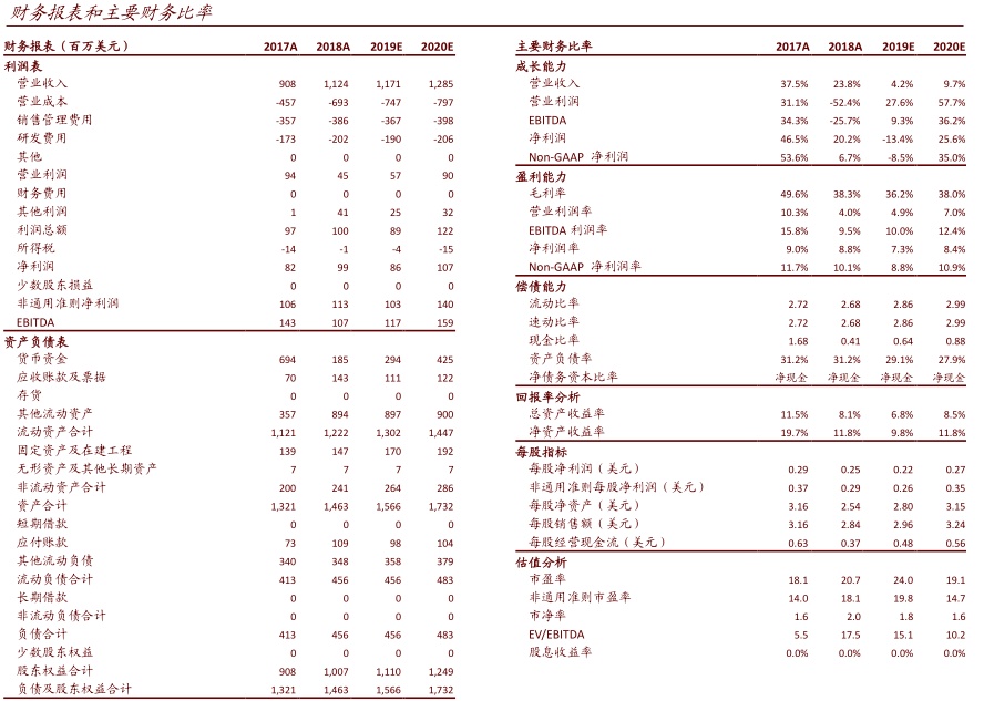 我们将 2019 和 2020 年收入预测分别下调 1.8%和 6.6%,同时将非通用准则下净利润预测分别上调 18%和 20.3%,以反应我们在上面提到的行业和公司业务趋势。 维持中性评级,将目标价上调至 4.3美元,存在 17% 的下行空间,对应 2020 年非通用准则下预测市盈率 12 倍。公司目前股价对应 2020 年非通用准则下预测市盈率 15倍。
