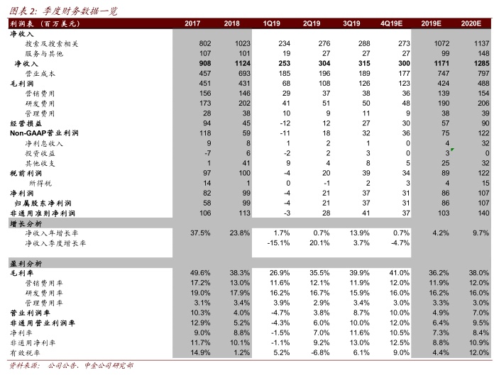 公司计划在其推荐业务中增加更多应用场景以更好地服务搜狗输入法 4.64 亿的庞大日活跃用户群体并进行商业化变现。我们认为战略聚焦推荐业务将为公司带来更多自有流量,降低买量费用率,从而对非通用准则净利润产生正面影响。但同时,我们也看到市场竞争加剧和搜索广告市场增长放缓对公司收入增长有着较大影响,使得公司利润率改善空间有限。我们预测非通用准则净利润率将从 2019 年的 9%升至 2020 年的 11%。